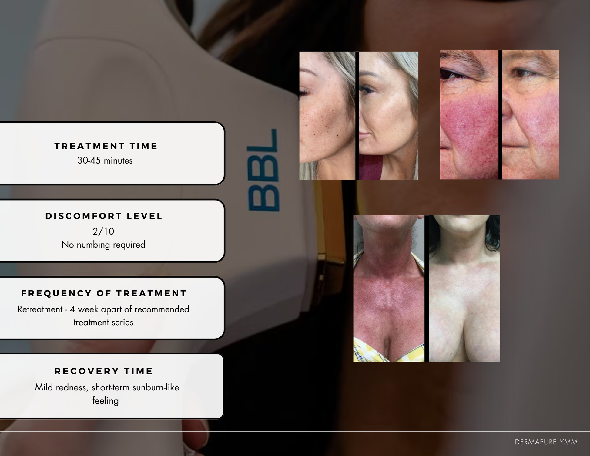 BBL treatment is not a laser treatment. It uses pulsed light (phototherapy) instead of the more focused light of a laser. Laser treatments are a single wavelength, while BBL uses a broad spectrum of light that we can filter several different ways to treat different conditions. It also treats a larger area of skin than a laser.