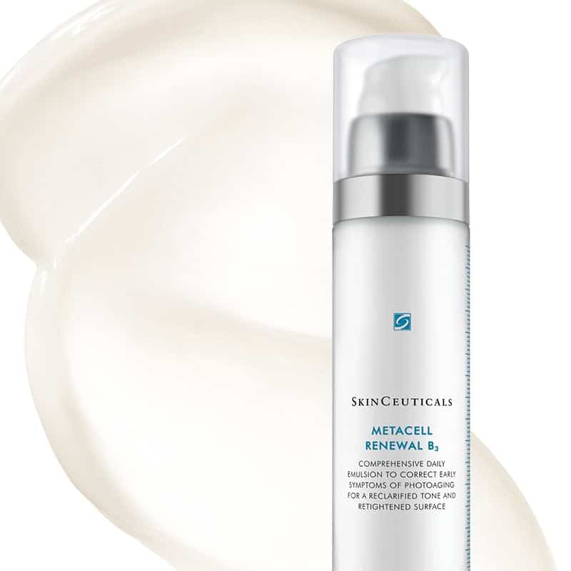 Metacell Renewal B3 utilizes a patent-pending aqueous emulsion to deliver a high concentration of 5% niacinamide (vitamin B3) combined with a firming tripeptide concentrate, and 15% pure glycerin to address early signs of photoaging. While signs of photoaging appear at different intensities according to skin biology, lifestyle, geography, sun protection behaviour, and skincare regimen, they have a multiplicative effect, creating a prematurely-aged appearance. This comprehensive daily emulsion visibly improves these early signs of photoaing by increasing cell turnover to resurface the skin, help reclarify and even skin tone, and improve the appearance of wrinkles and surface elasticity.