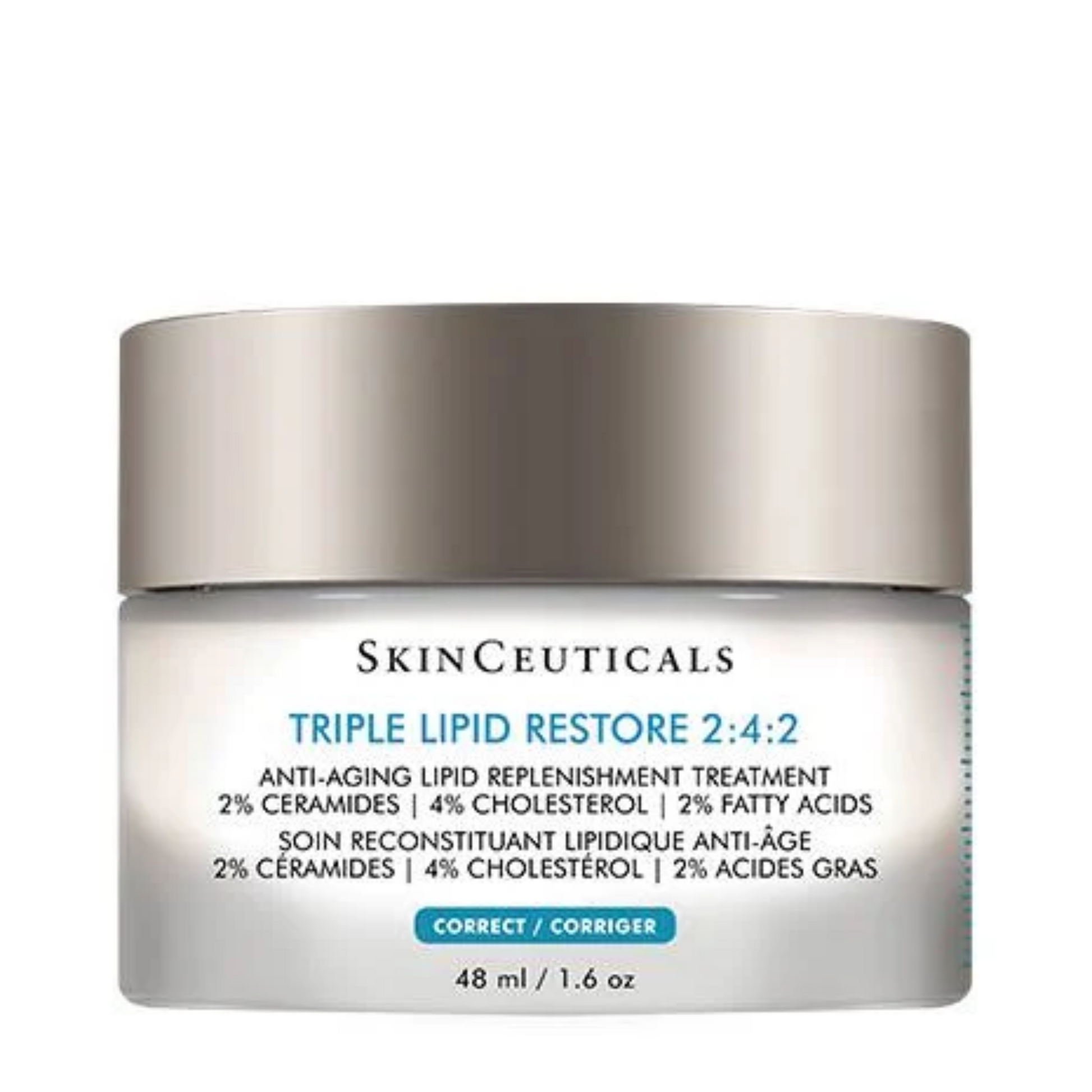 A patented and unique anti-aging cream to nourish dry skin & rebuild the skin's moisture barrier. U.S. Patent No. 10,137,073.Skinceutical's Triple Lipid Restore 2:4:2 is an anti-aging cream that contains the patented lipid ratio of 2% pure ceramides 1 and 3, 4% natural cholesterol, and 2% fatty acids, which is proven to nourish dry skin and reverse signs of aging. Optimal for anti-aging skincare, this lipid correction cream contains the first 2:4:2 cholesterol-dominant ratio to help restore the skin's external moisture barrier and support natural self-repair. As one of our best anti aging creams, Triple Lipid Restore 2:4:2 potently nourishes aging skin which leads to improvements in the visible appearance of skin smoothness, laxity, pores, and overall radiance.